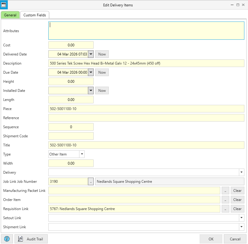 Delivered On Site - Details Items delivered on site can be double clicked within the table to see further details for that item